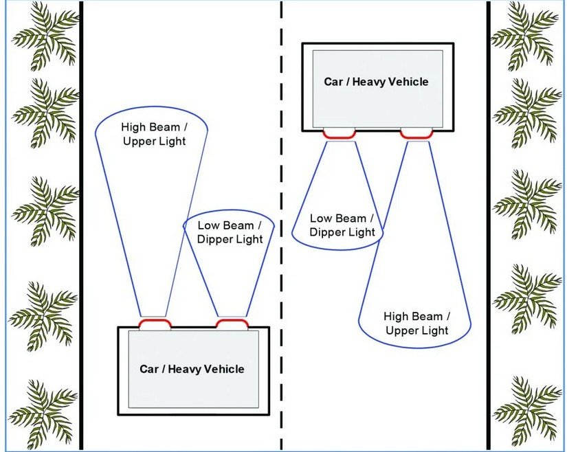 If the vehicle is equipped with the suggested switch that works on combined high beam and low beam, the effect will avoid probable accidents. Generally, all the cars or trucks are already equipped with the upper and dipper switch individually. Now it is required to introduce an additional switch that will give light on the roads. If both the vehicles are equipped with this new switch and if both the drivers turn it on, the lighting pattern will be as shown in the figure. The light on the driver side will work in dipper mode and on another side it will be upper mode. Dipper mode is useful to avoid glaring effects i.e. temporary blindness and upper beam is useful to increase the visibility for long-range. This long-range is useful to find any objects like parked vehicles, pedestrians, bikes, and animals and also to control the vehicle to go away from the roads. The switch can be used manually when required.